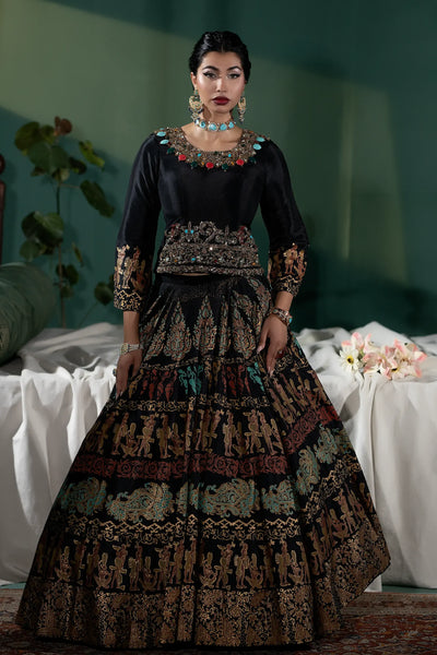 Siyah is a stunning black pishwas that radiates elegance and charm. Embellished with crystals, dabka, sequins, and stones, its intricate detailing and traditional embroidery make it the perfect choice for any special occasion. This two-piece ensemble, with its regal design and rich embellishments, captures timeless beauty and sophistication.