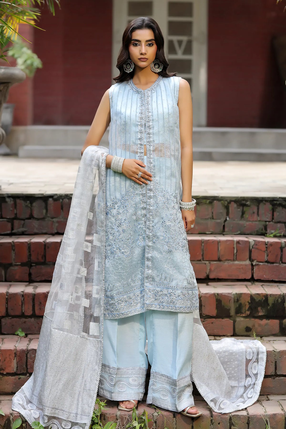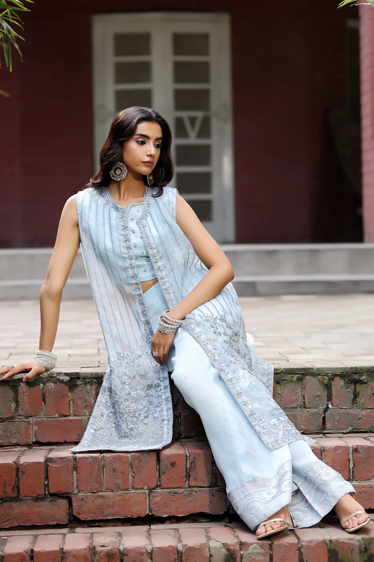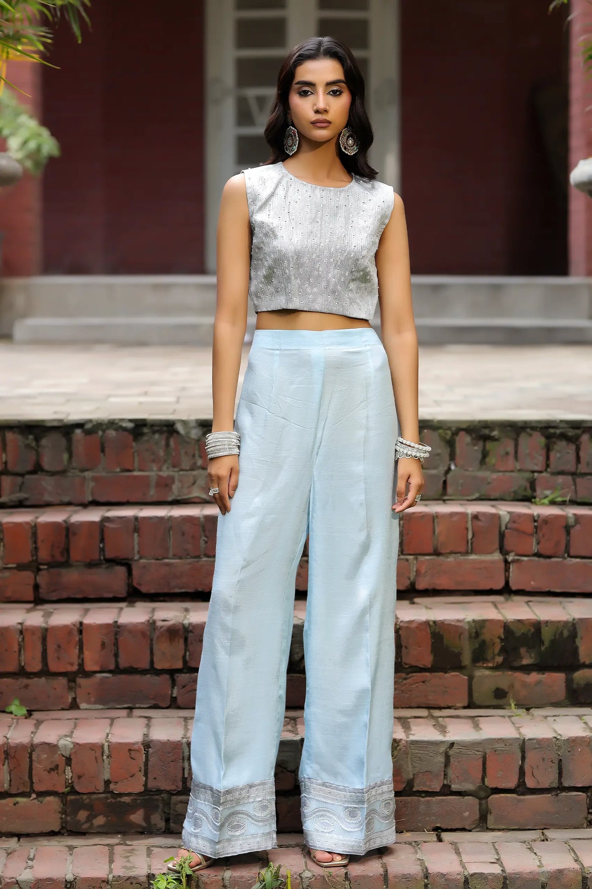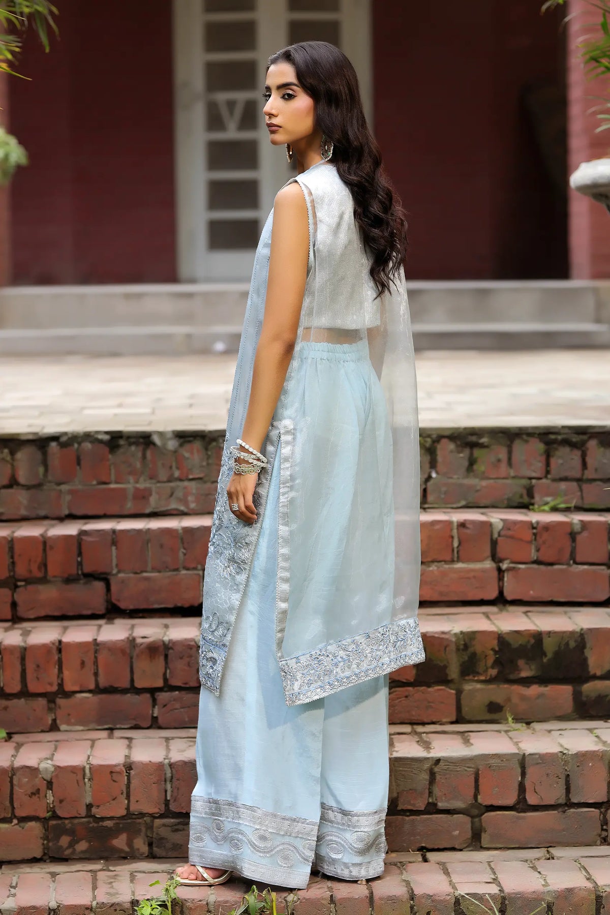 Exude elegance in this breathtaking Powder Blue ensemble, featuring a delicate Organza shirt with intricate silver Tilla and Zari embroidery, adorned with subtle sequins, dapka, and beadwork. The sleeveless design highlights the shirt's subtle vertical pleating and self-stripes, paired with flowing wide-leg Raw Silk trousers for a sophisticated look. Perfect for formal events, weddings, or special occasions