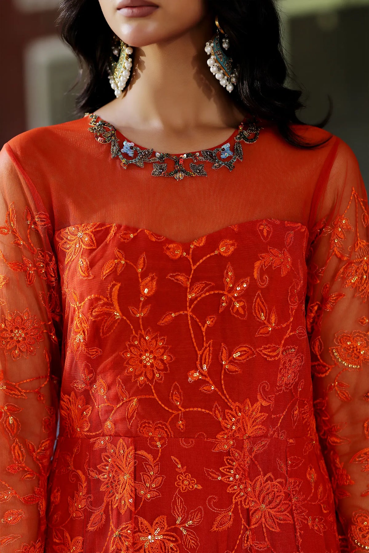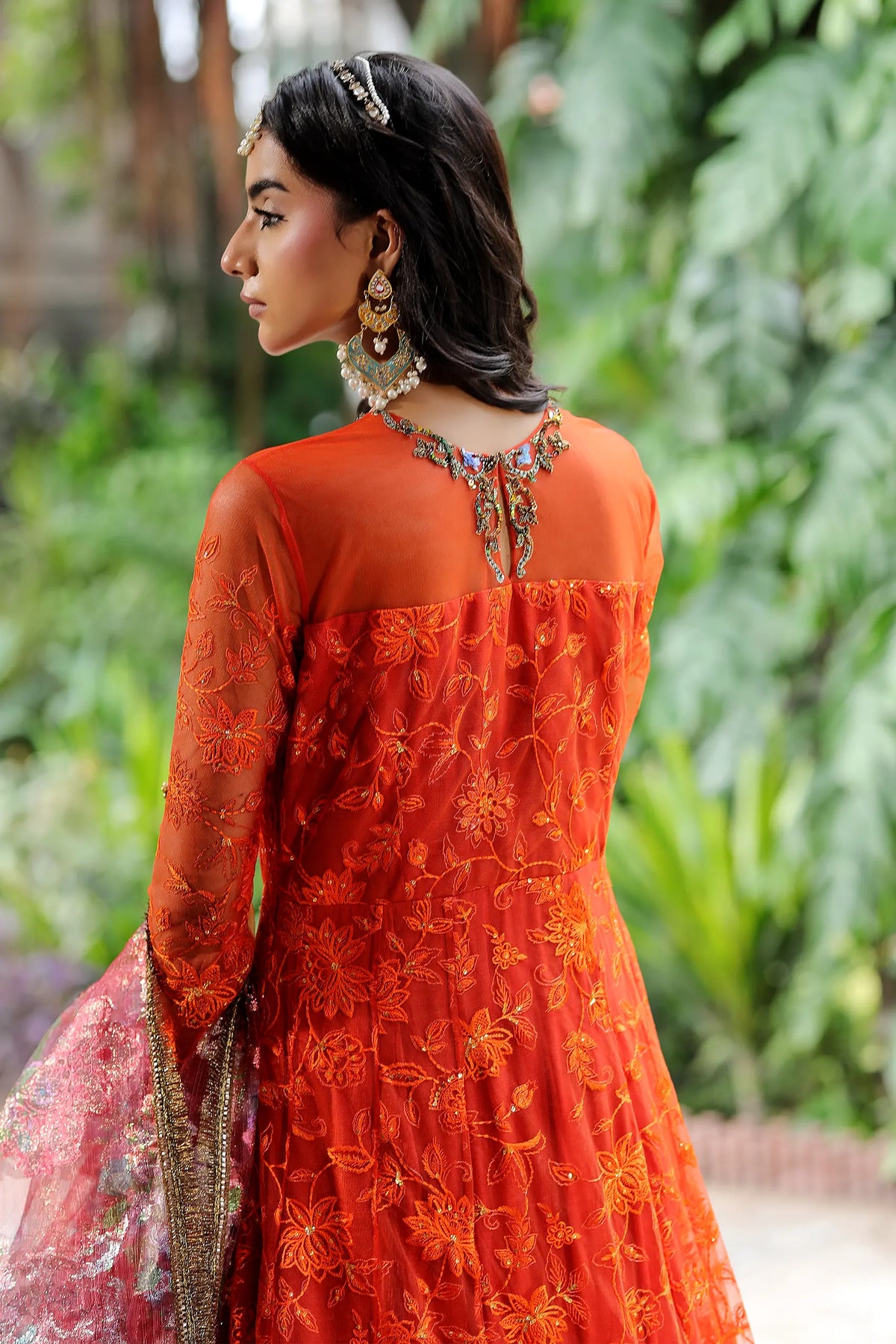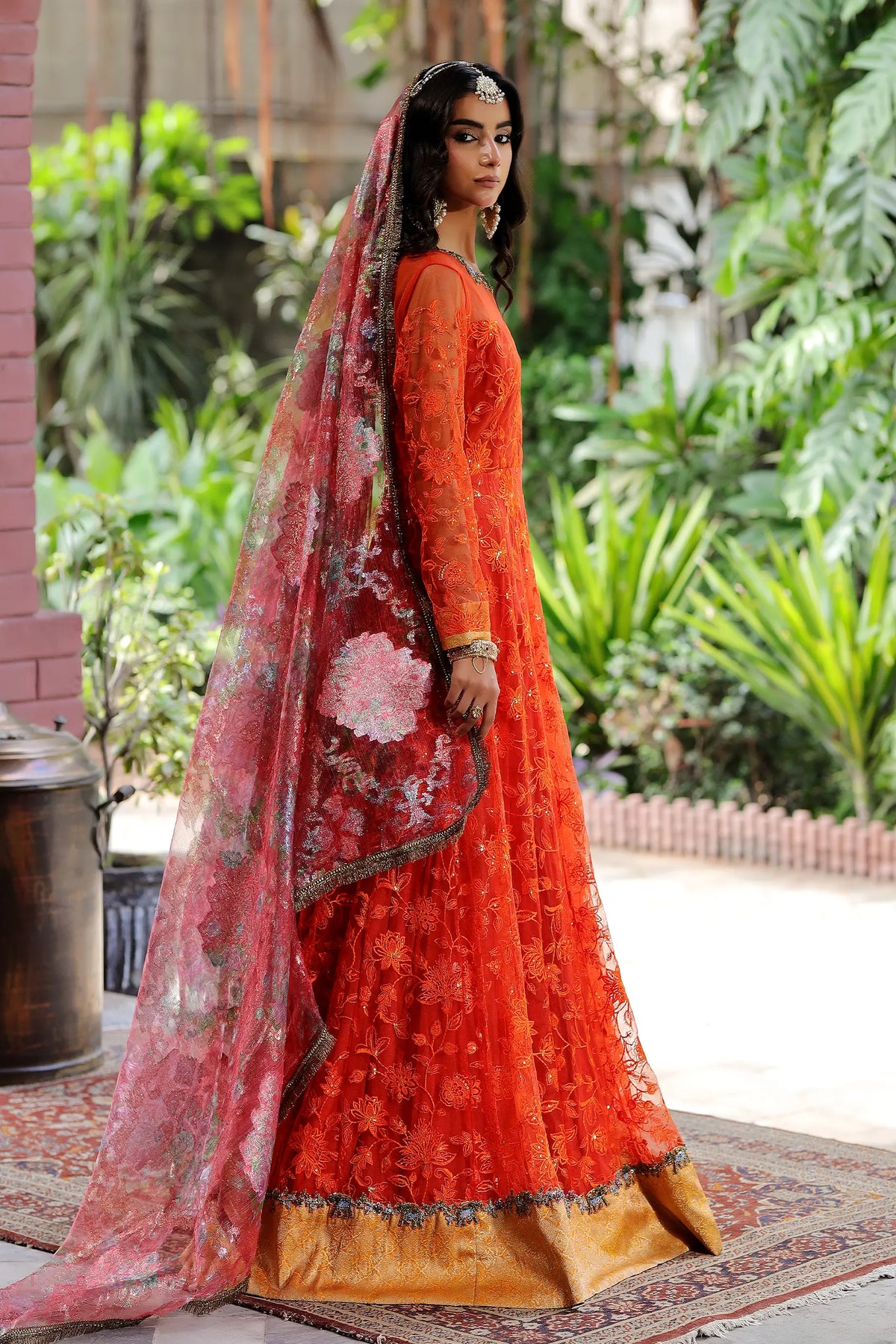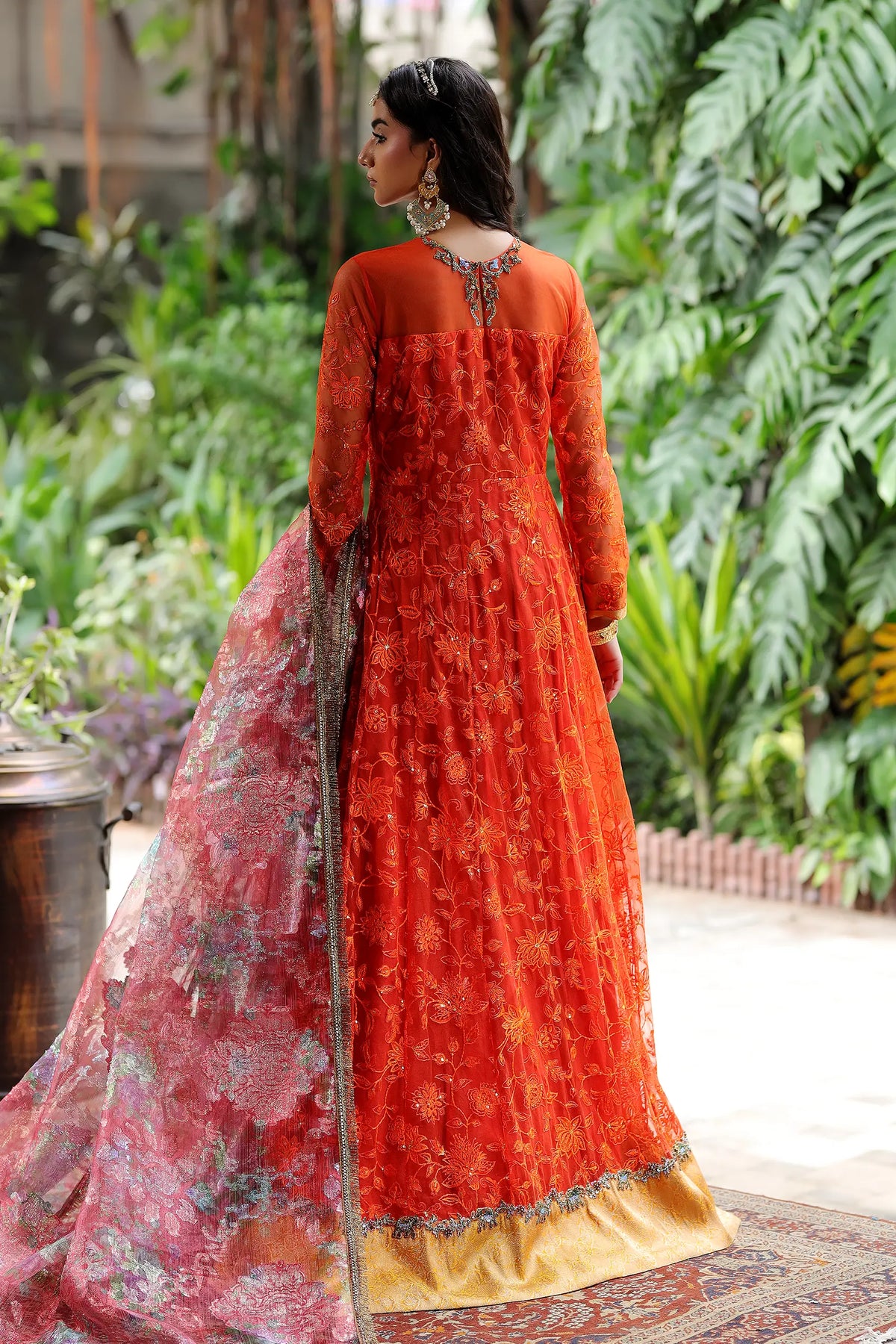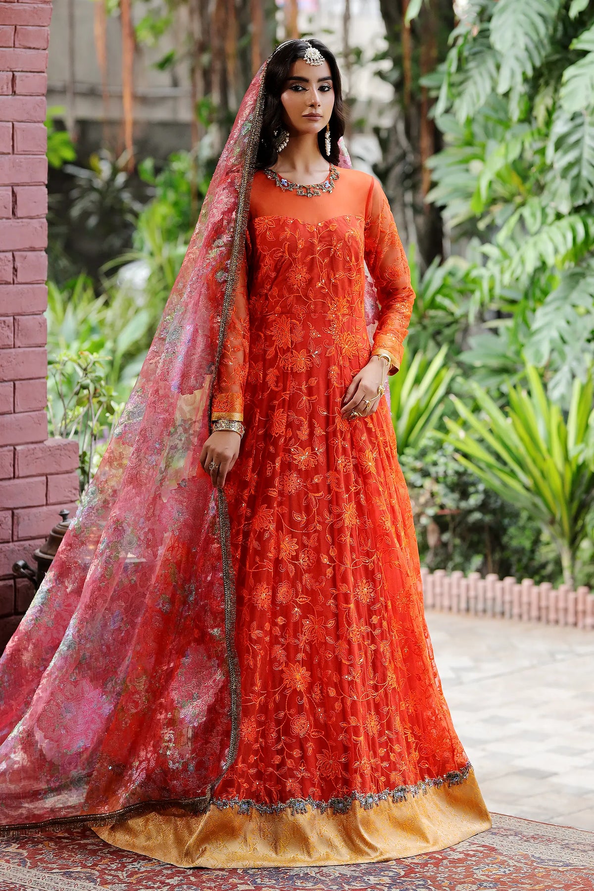 Dazzle in this stunning Marigold Orange net pishwas, adorned with intricate thread embroidery, sequins, and dapka work. The contrasting jamawar border and gold brocade add a touch of luxury. Paired with a vibrant floral organza duppatta, perfect for making a statement at Mehndi, Mayun, garden parties, or special celebrations.