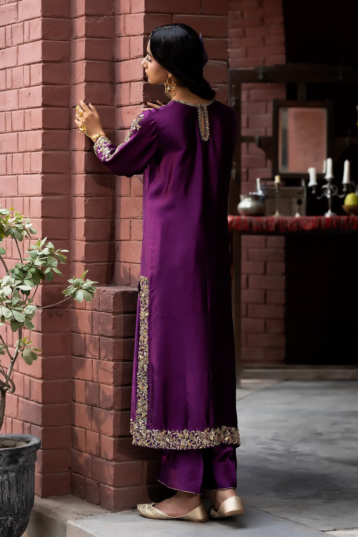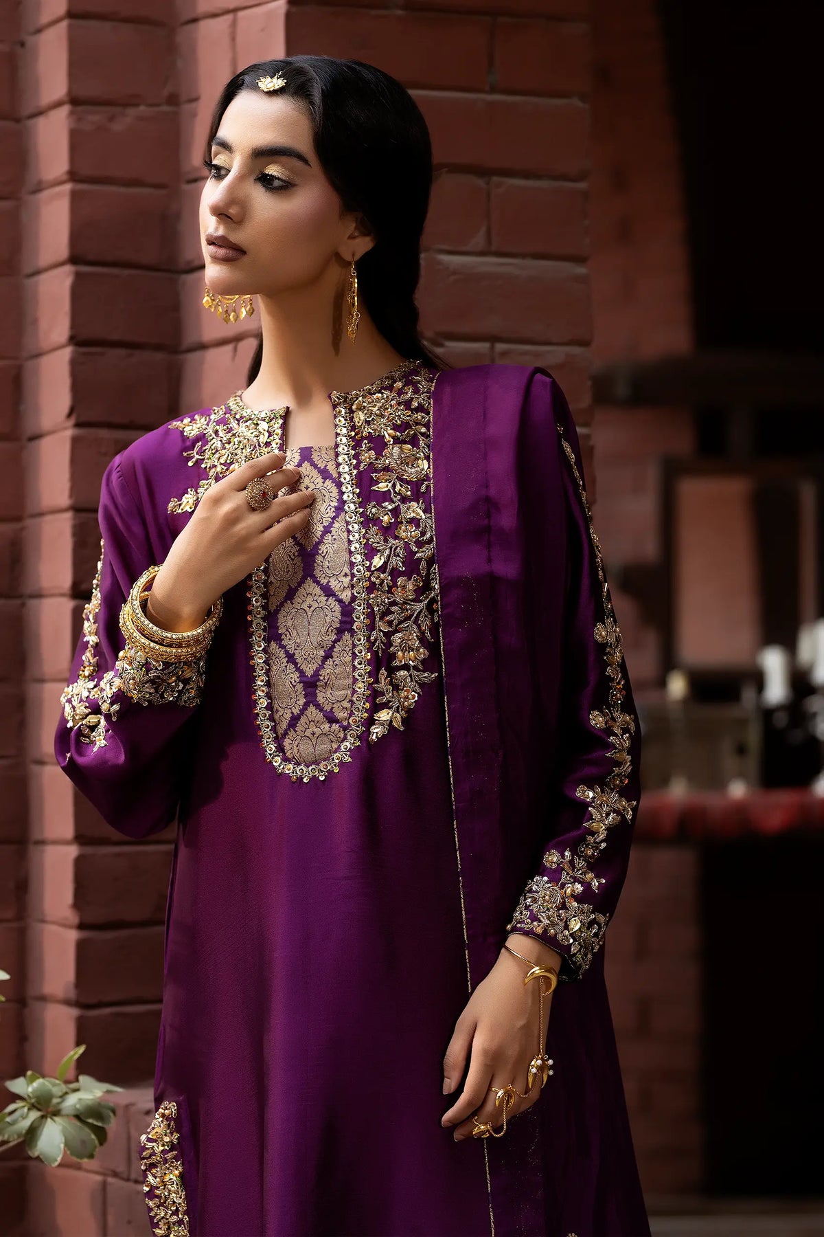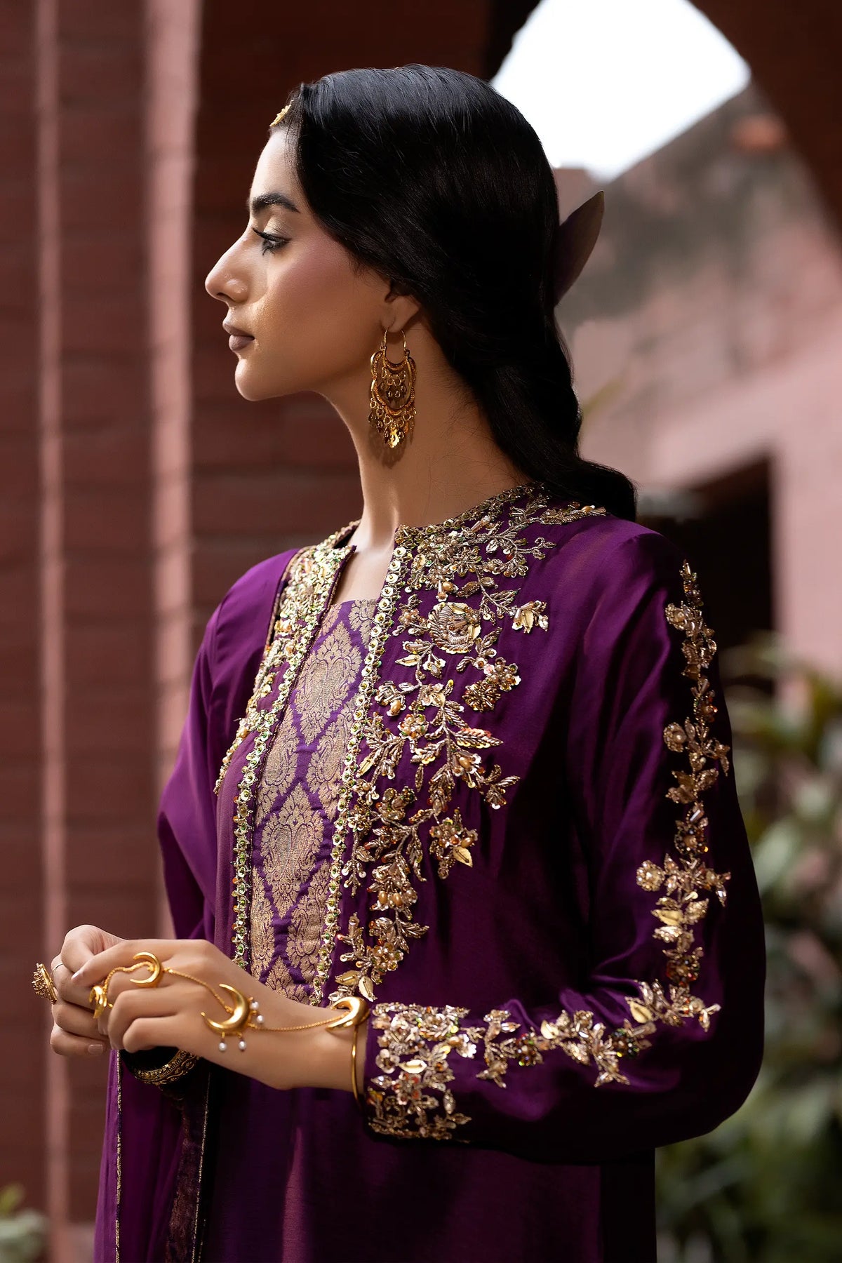 Embrace unparalleled sophistication with this stunning 3-piece suit in deep amethyst purple sheesha silk. Featuring exquisite embroidery and embellishments on the kameez, with a lavishly designed neckline, central panel, and ornate cuffs. Paired with matching trousers and a simple yet elegant dupatta, perfect for weddings, formal gatherings, and celebratory events.
