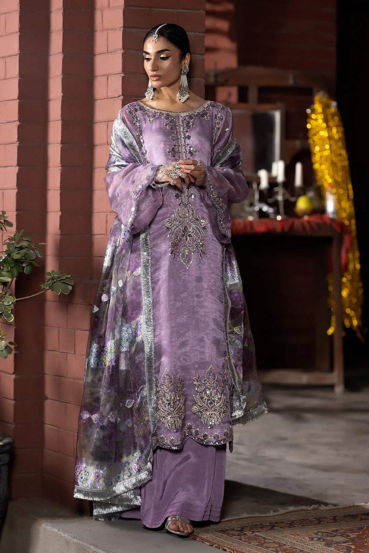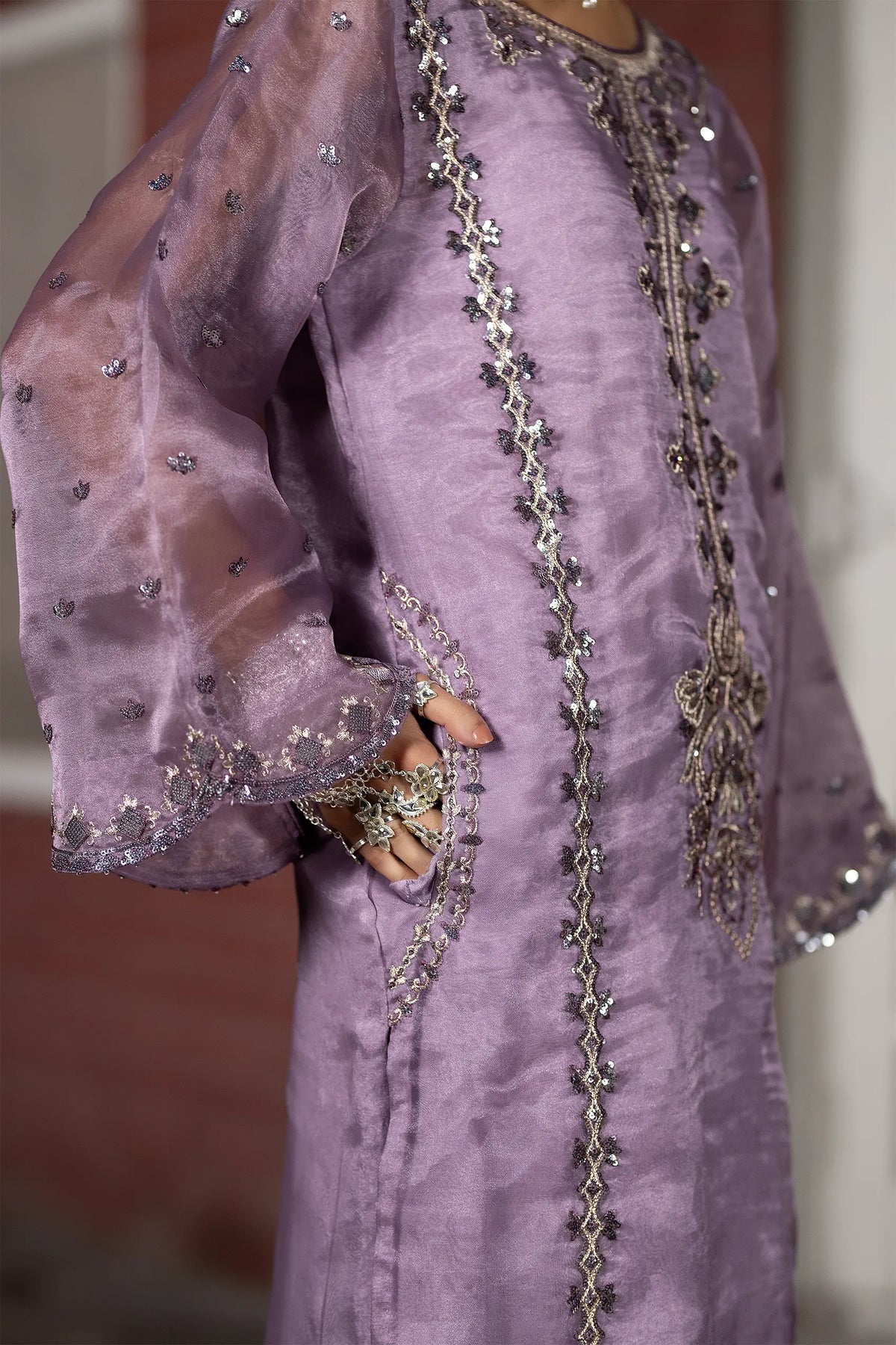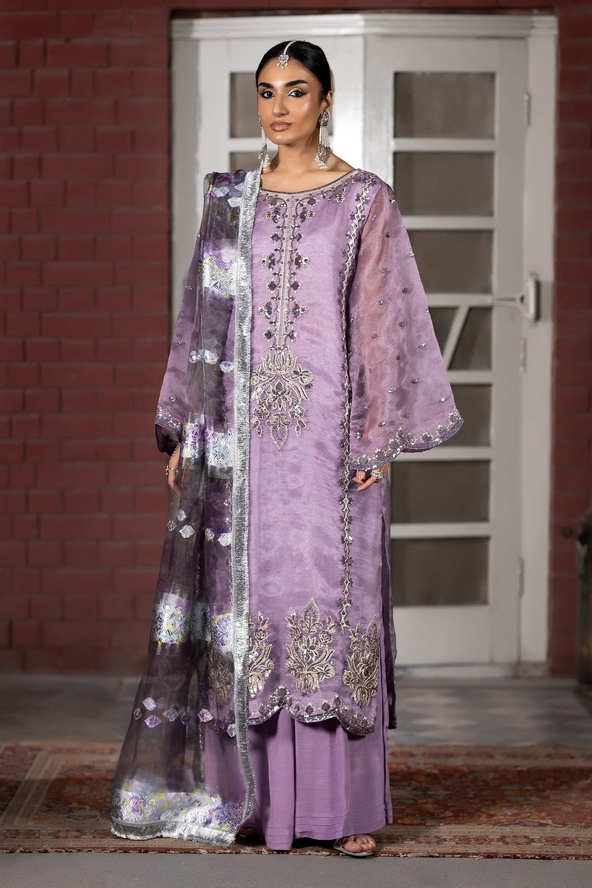 Make a statement in this breathtaking Lavender Purple Organza ensemble, showcasing exquisite silver Tilla and Zari embroidery, intricately detailed with delicate sequins, moti, and dabka work. The elegant straight-cut long shirt with flared bell-sleeves is paired with flowing wide-leg trousers, creating a refined and contemporary look. The stunning printed Organza Duppatta adds a touch of modern artistry, perfect for daytime semi-formal events, Nikkah ceremonies, or sophisticated gatherings where refined elegance is desired.