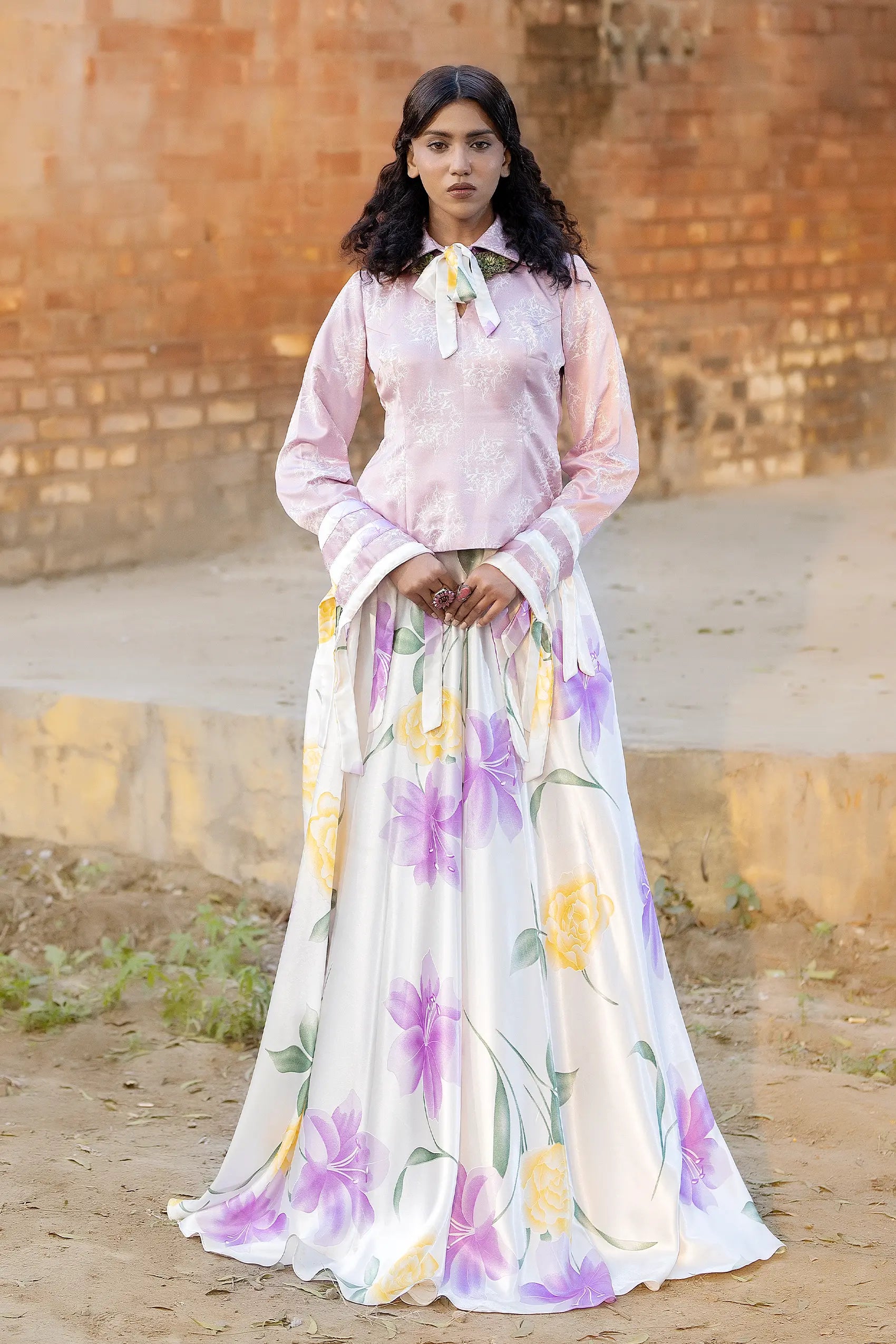 Introducing our elegant dress set featuring a beautifully crafted blouse and a flowing skirt, designed to make a statement. The blouse showcases a delicate blend of soft pastel colors, including blush pink, purple and creamy ivory, creating a fresh and feminine look. Its intricate detailing adds a touch of sophistication, making it perfect for both casual and formal occasions. The skirt complements the blouse with its rich, deep hue, which contrasts beautifully with the lighter tones of the top. This combination not only enhances the overall aesthetic but also offers a flattering silhouette. The dress is designed for comfort and style, ensuring you feel confident and chic no matter where you go. Elevate your wardrobe with this stunning blouse and skirt set, perfect for making a lasting impression!Â