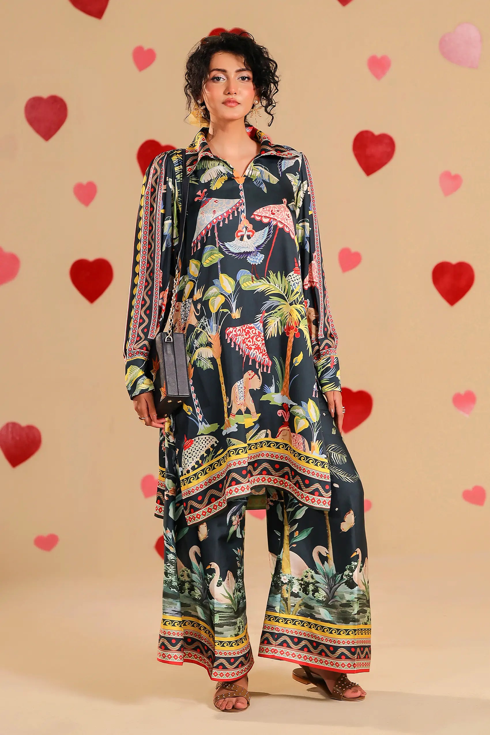 Experience elegance with the Bagh set, featuring a smooth printed silk shirt paired with matching silk trousers. Perfect for a refined and comfortable look.