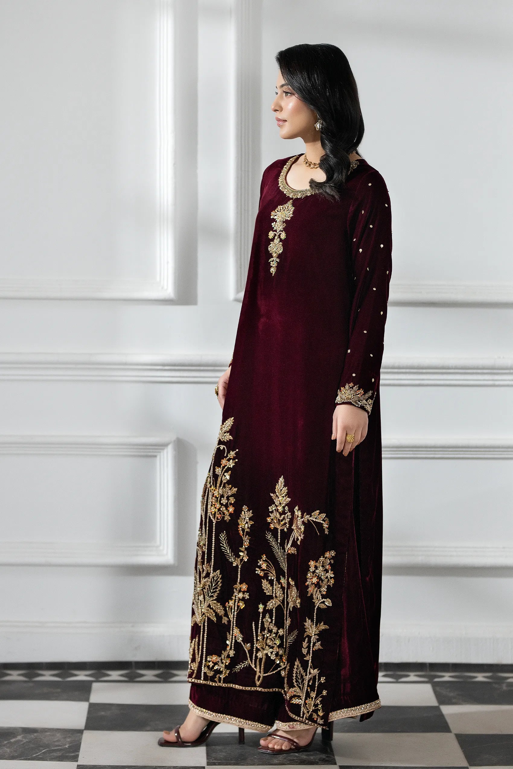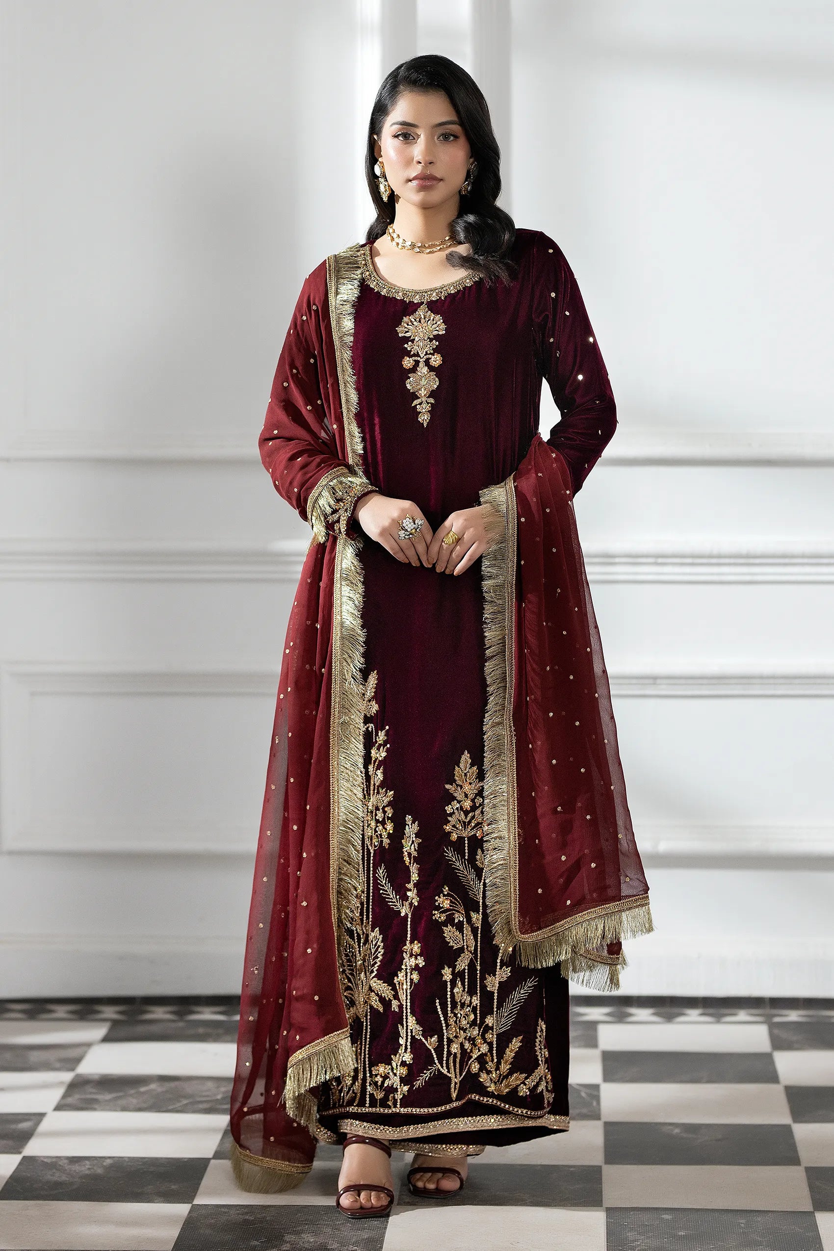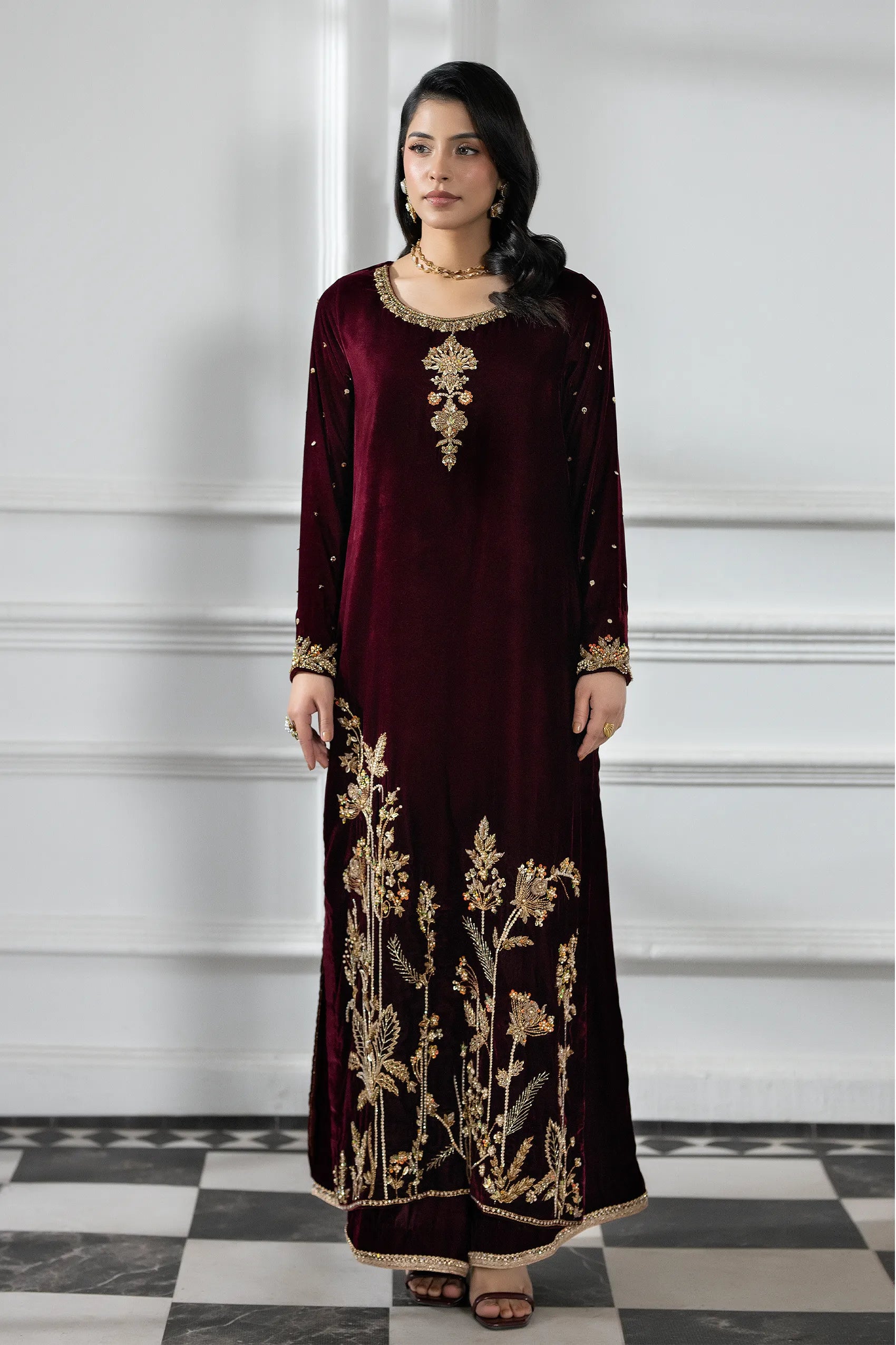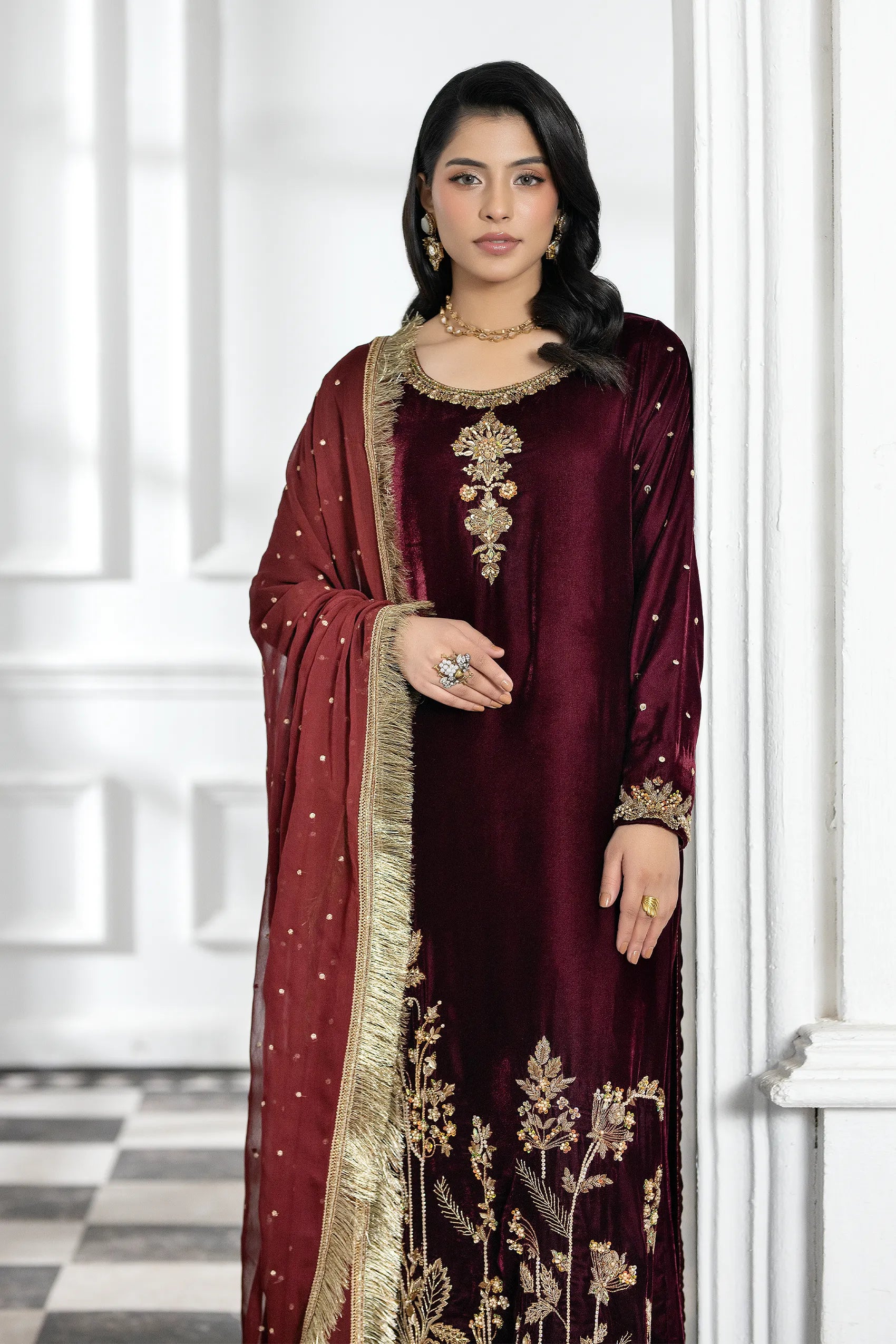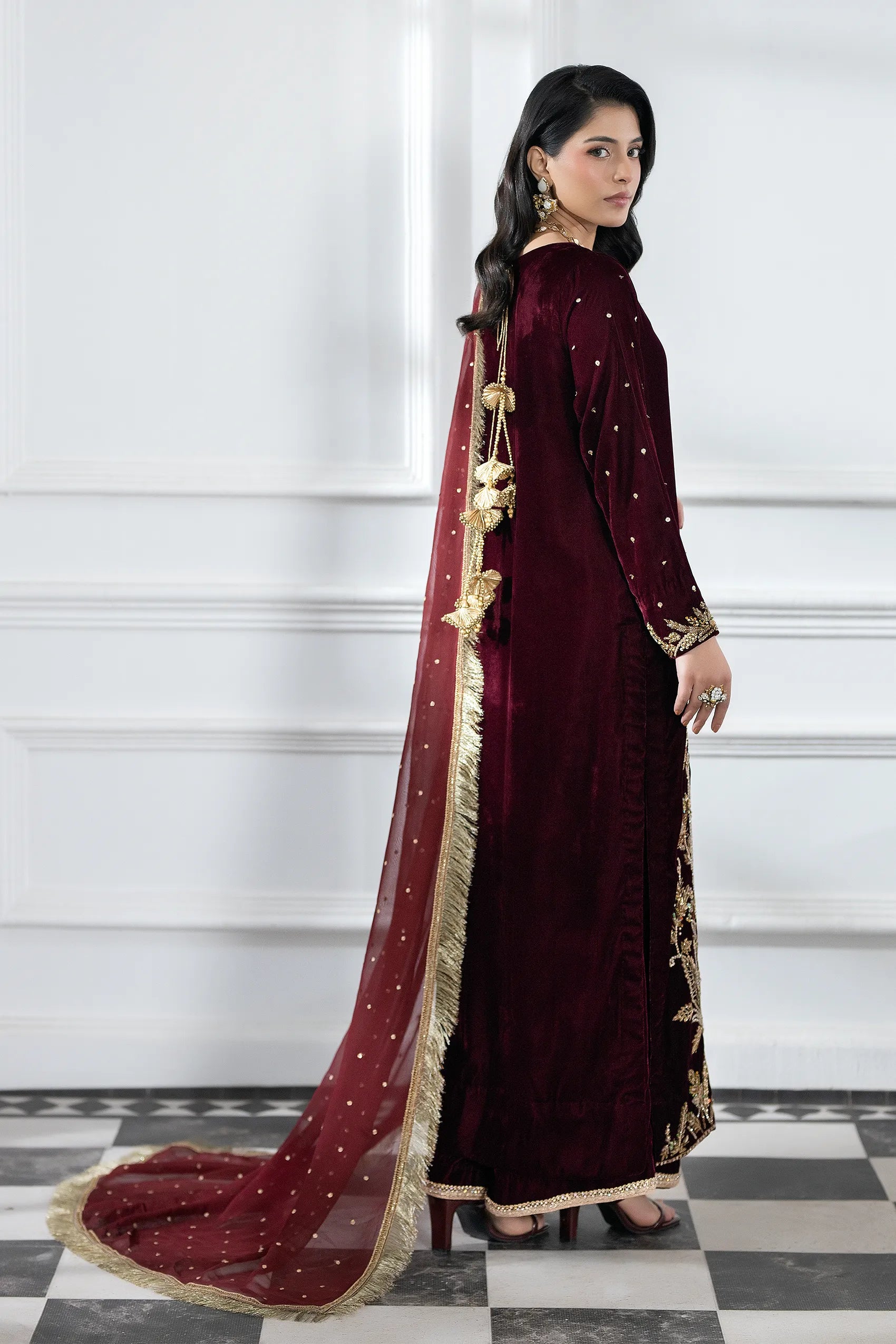 This outfit features a rich maroon velvet shirt lavishly adorned with ascending tilla, sequins, crystals, dapka, kora and zardozi floral adda work from hem to chest. A heavily embellished neckline medallion and intricately embroidered cuffs add regal drama, while tiny booti scatter across the sleeves for balanced texture. Paired with matching velvet trousers trimmed in thin gold lace and a chiffon dupatta dotted with gold‑zari booti, it’s a picture of timeless, luxurious elegance.
