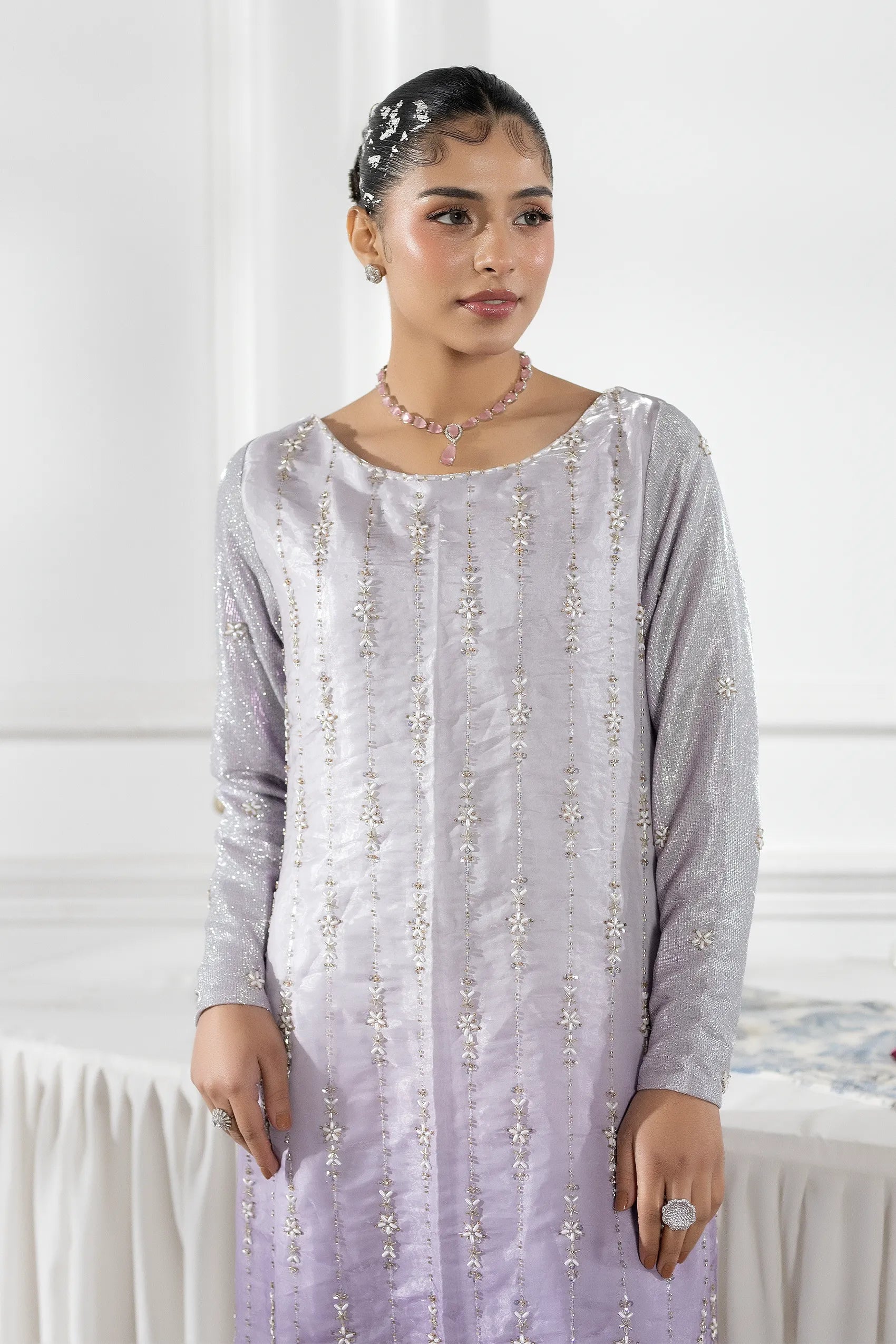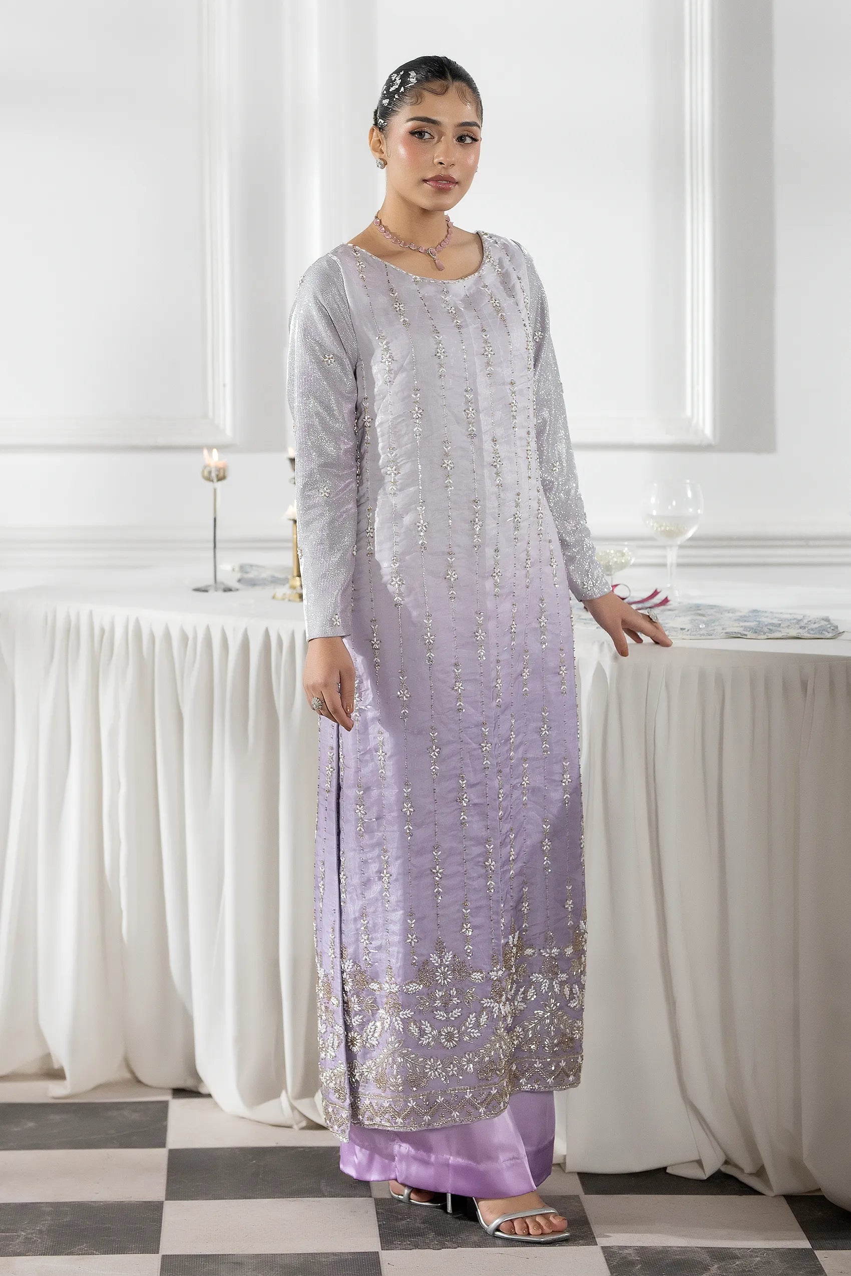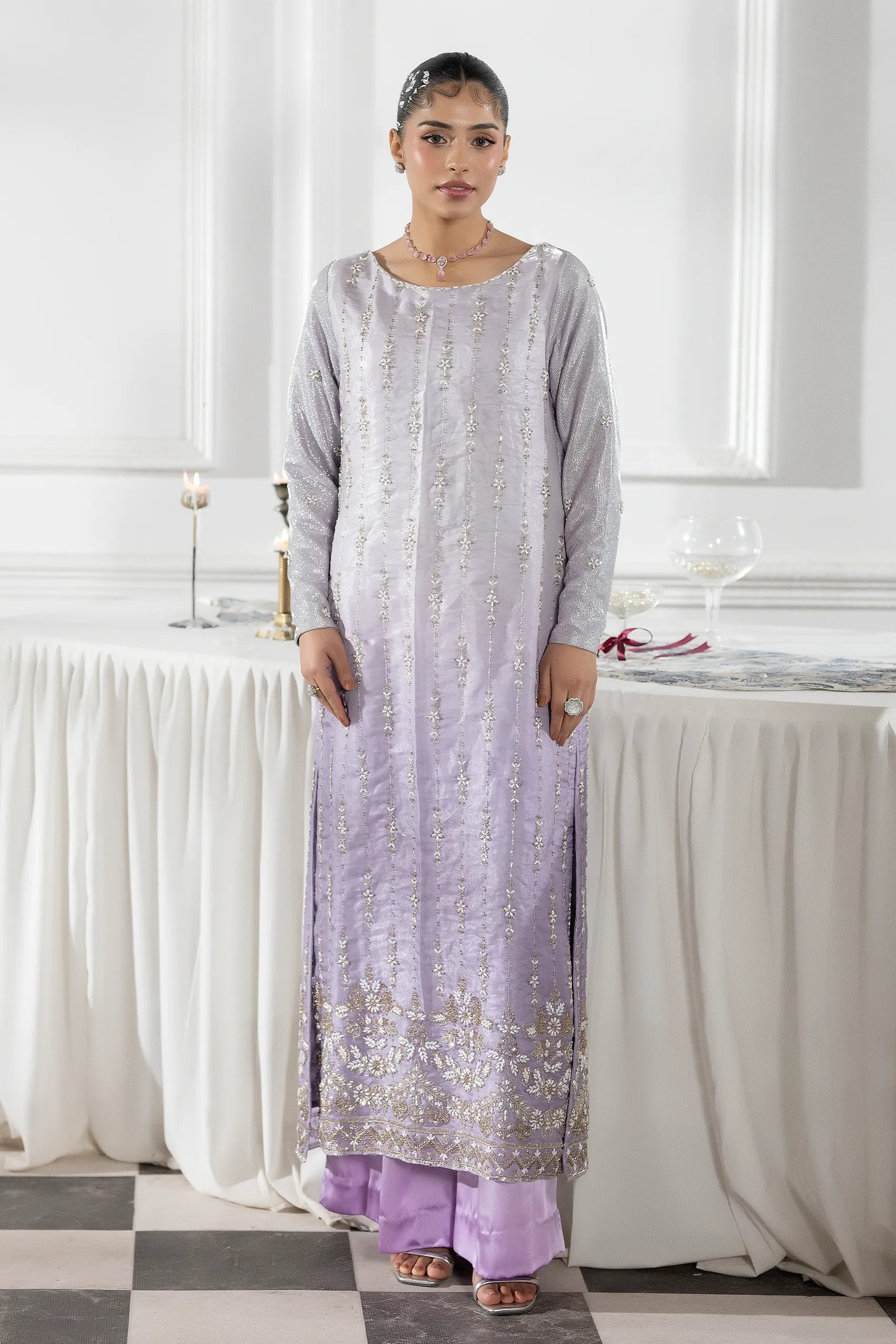 This outfit is a Lavender Ombre Heavily Embellished Formal, designed for high-glamour evening events like weddings or receptions. The shirt features a stunning ombré (gradient) effect, transitioning from a soft silver-lilac at the shoulders to a deep, rich lavender at the hem. The entire front is adorned with vertical booti lines and a dense, intricate floral border at the hem, using zardozi, sequins, and silver thread work. A classic long, straight shirt paired with matching lavender silk wide-leg trousers, creating a sleek and elongated profile.