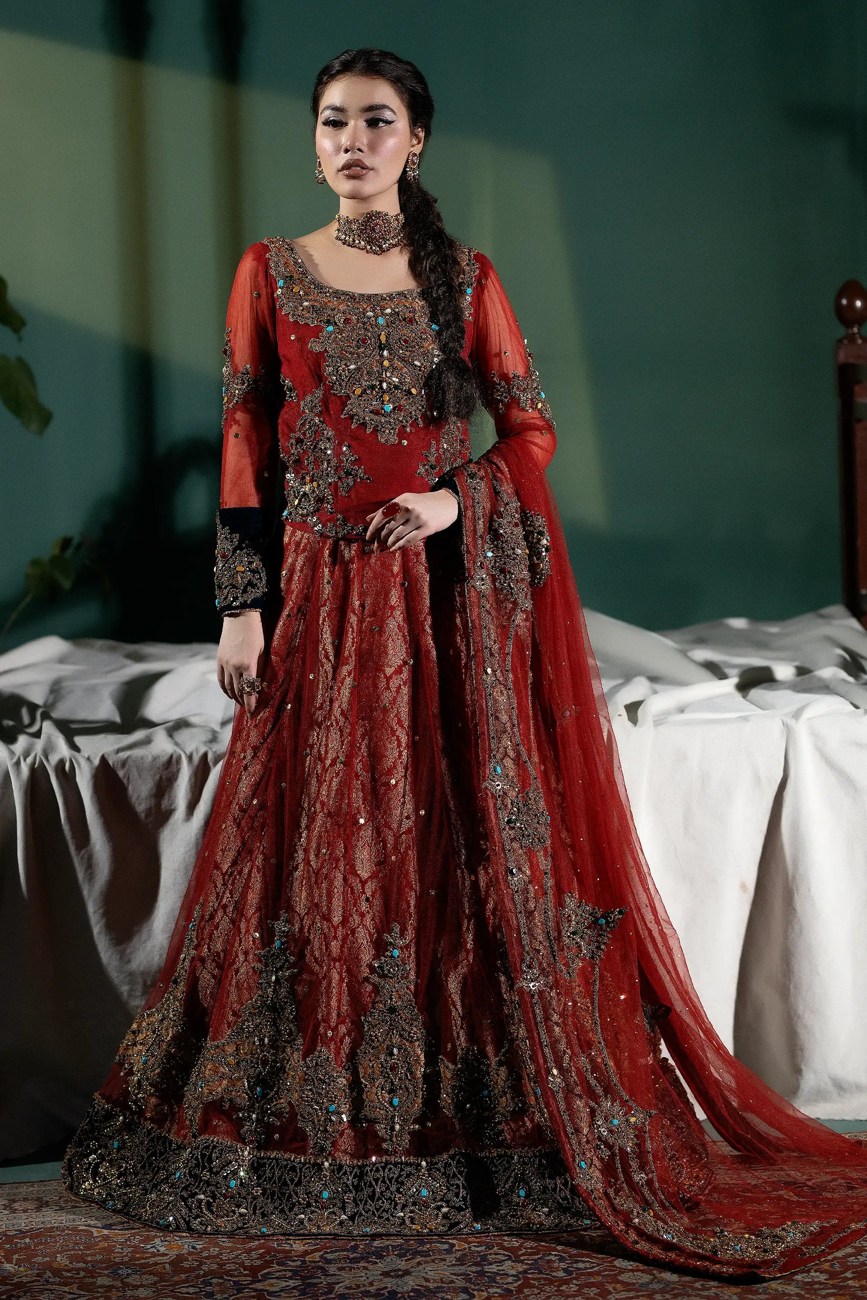 What truly sets the Mehr Bano dress apart is the detailed dori work, embellished with shimmering stones, sparkling crystals, intricate dabka, and lustrous pearls. Each embellishment is thoughtfully placed, creating a mesmerizing effect that captures the light and attention. Perfect for weddings and grand celebrations, the Mehr Bano dress is designed to make you feel like royalty on your special day!