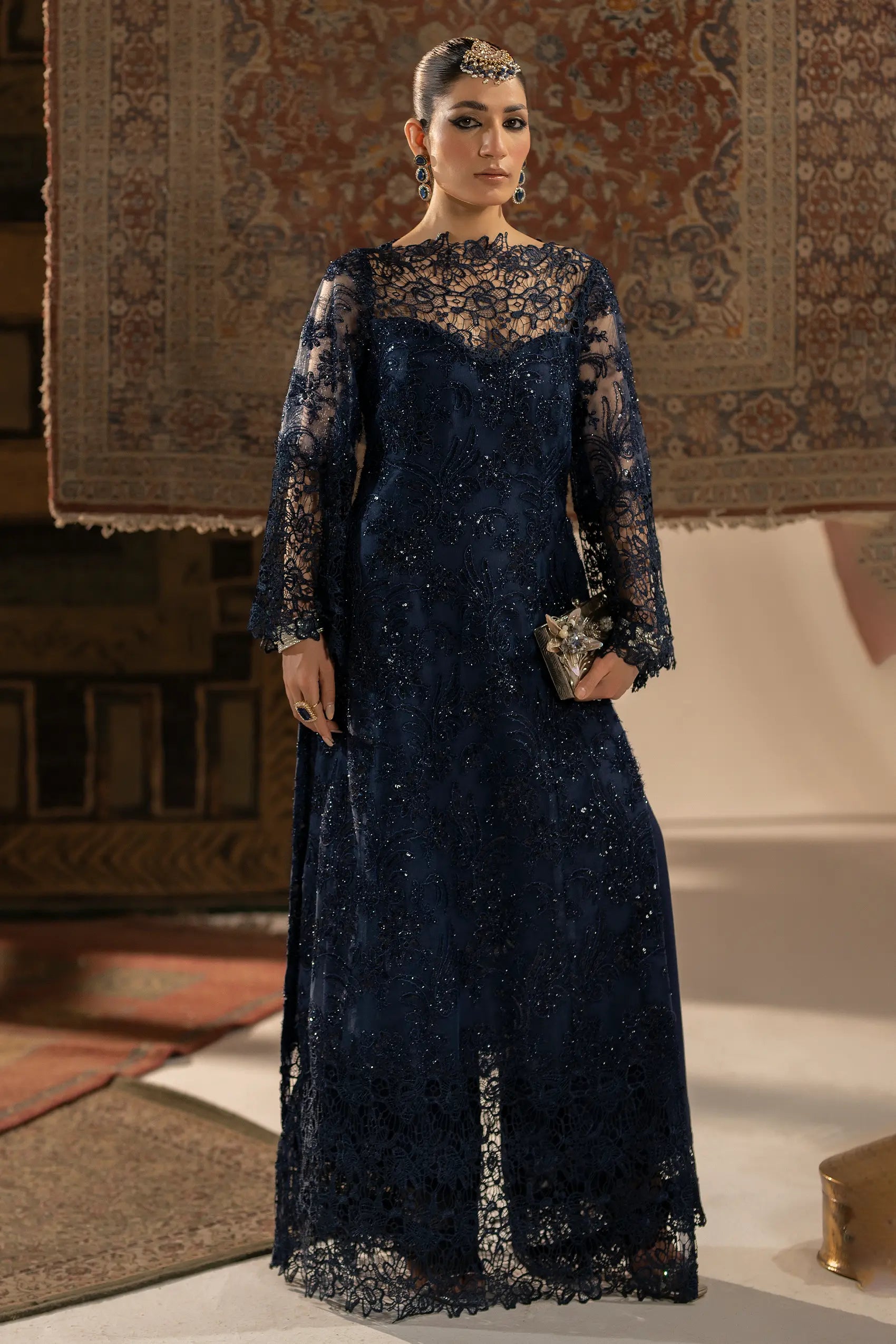 This exquisite ensemble is a symphony of midnight blue, adorned with intricate lacework and shimmering sequins. The flowing silhouette and delicate detailing create a look that is both elegant and ethereal.Product detailsShirt: NetTrouser: US Silk