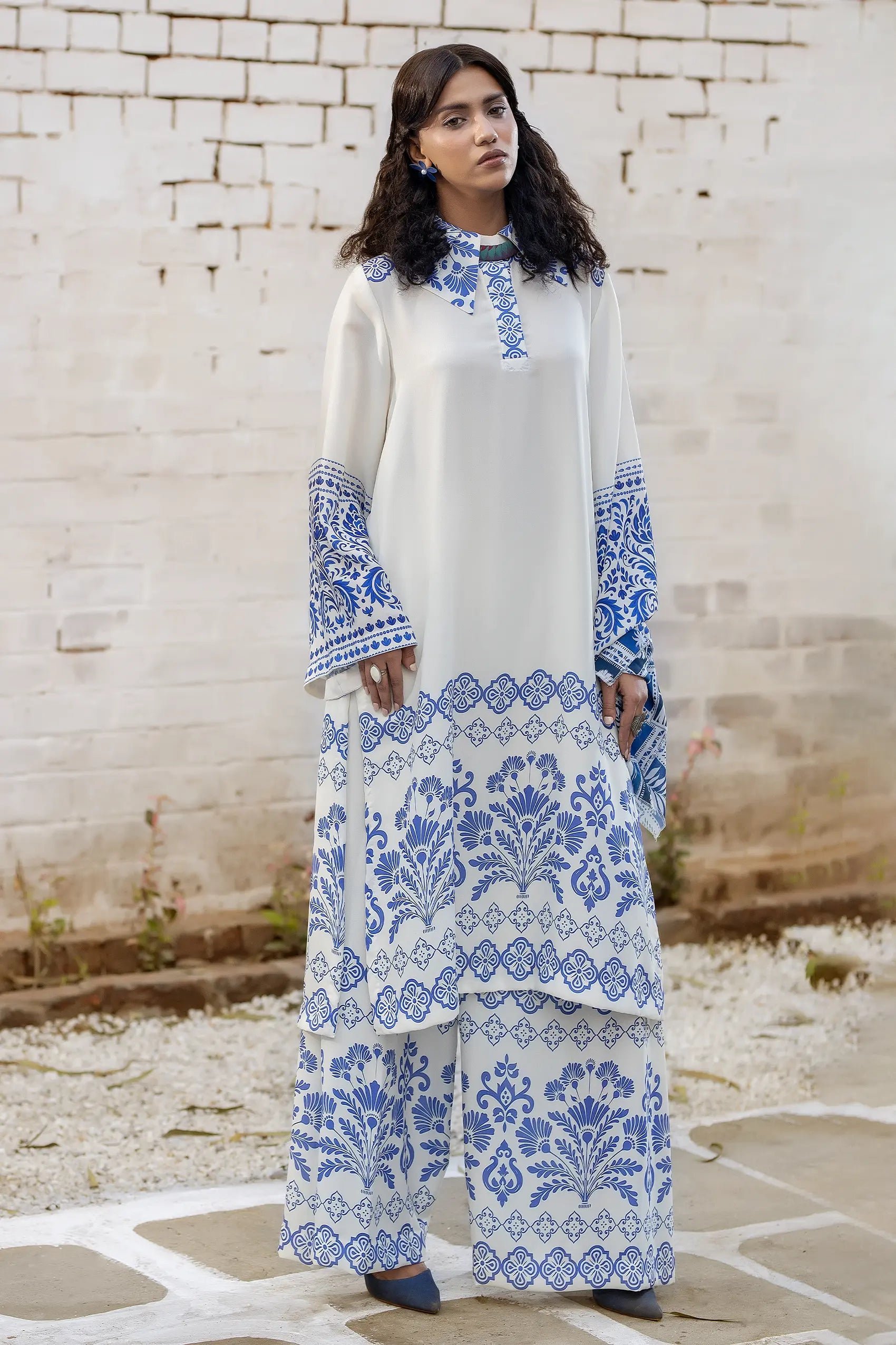 This beautiful outfit features a long shirt in a soft ivory hue, adorned with elegant blue printing that adds a touch of sophistication. The shirt has a relaxed fit, allowing for comfortable wear while maintaining a chic look. The intricate blue patterns create a stunning contrast against the ivory background, making it perfect for both casual outings and more polished events. Paired with loose-fit trousers, this ensemble offers a perfect blend of style and comfort. The trousers are designed to flow effortlessly, providing ease of movement while complementing the long shirt beautifully. This outfit is ideal for those looking to make a fashionable statement while enjoying a relaxed fit. It's a versatile choice that can be dressed up or down, making it a must-have addition to any wardrobe.