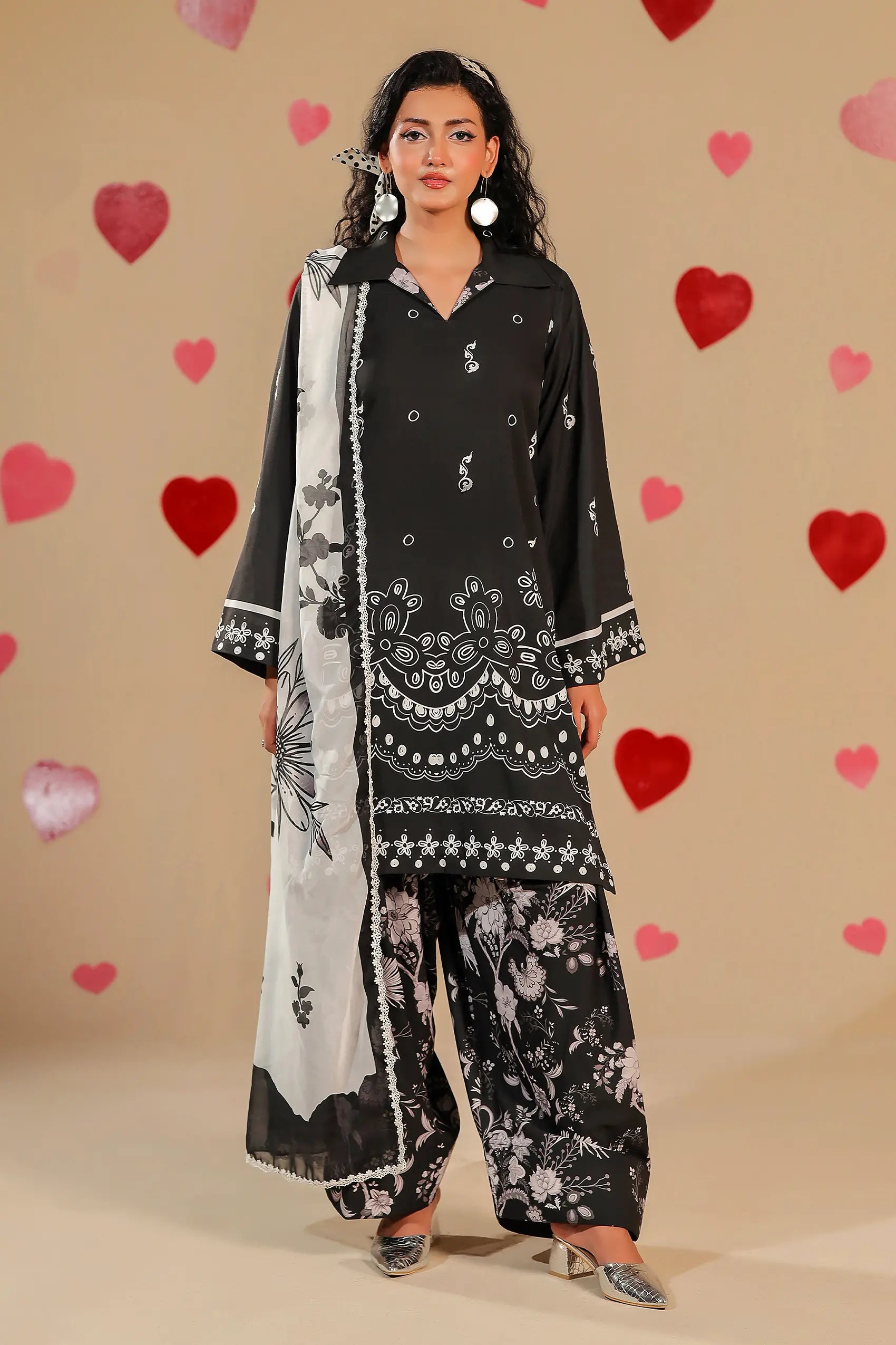 This elegant Parisa set features a crepe shirt paired with a matching crepe shalwar and a delicate chiffon dupatta, offering a comfortable and stylish ensemble.