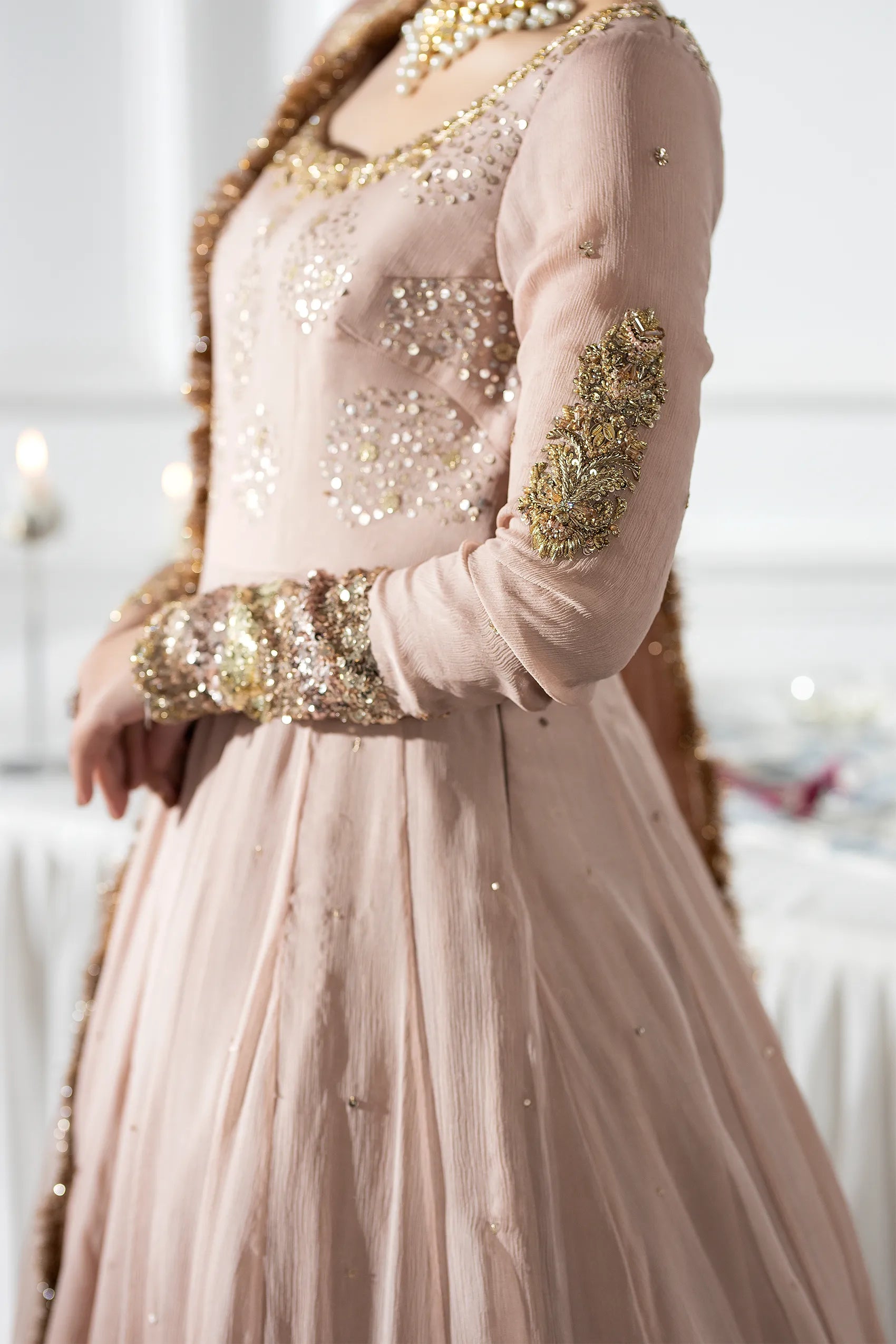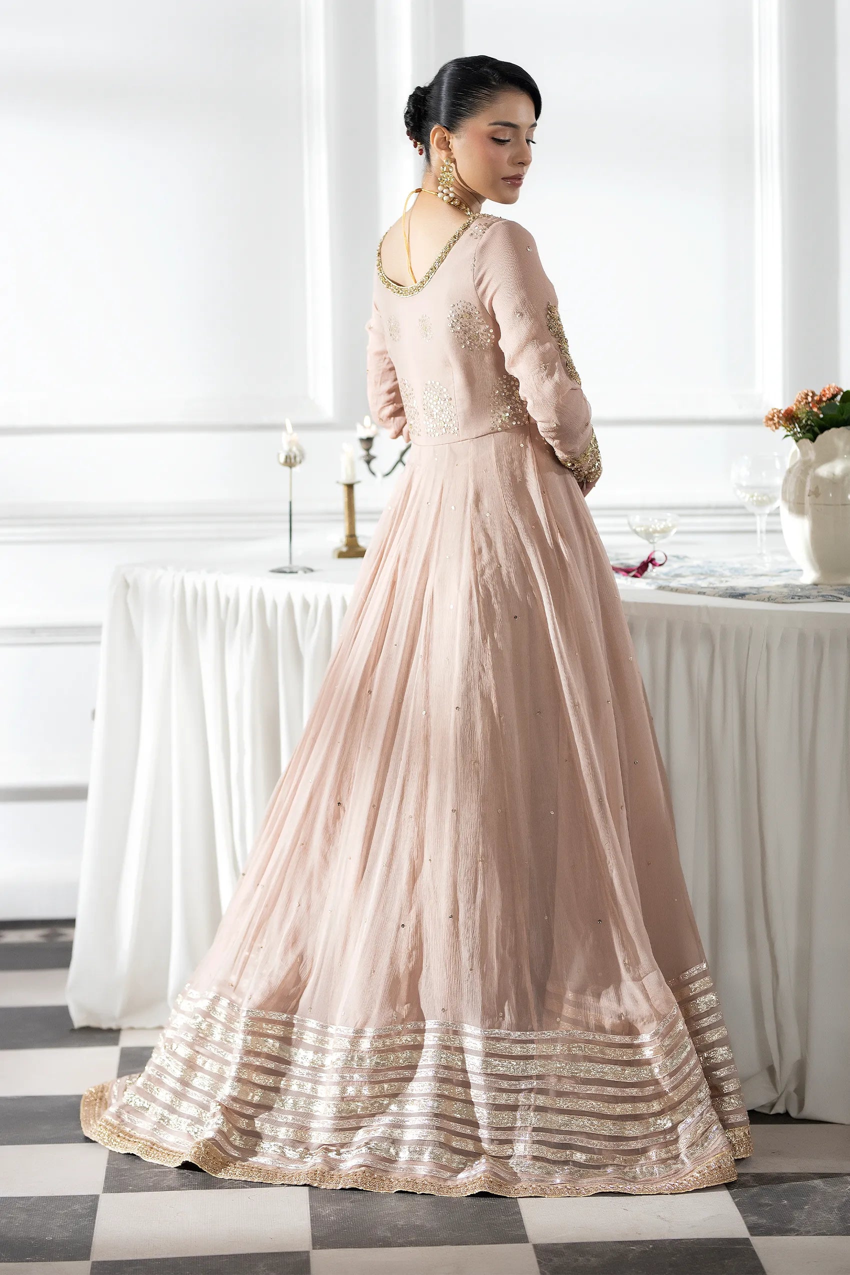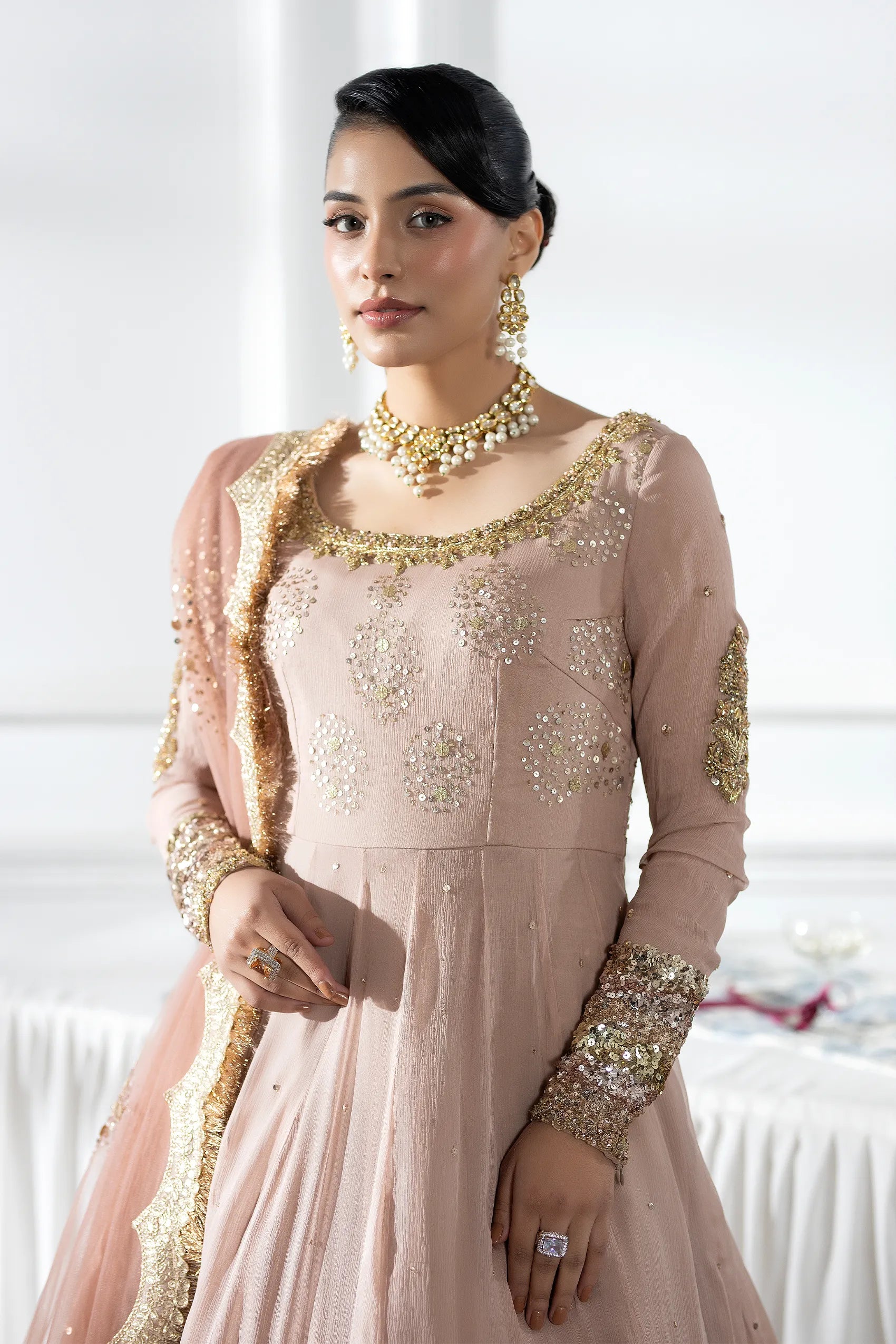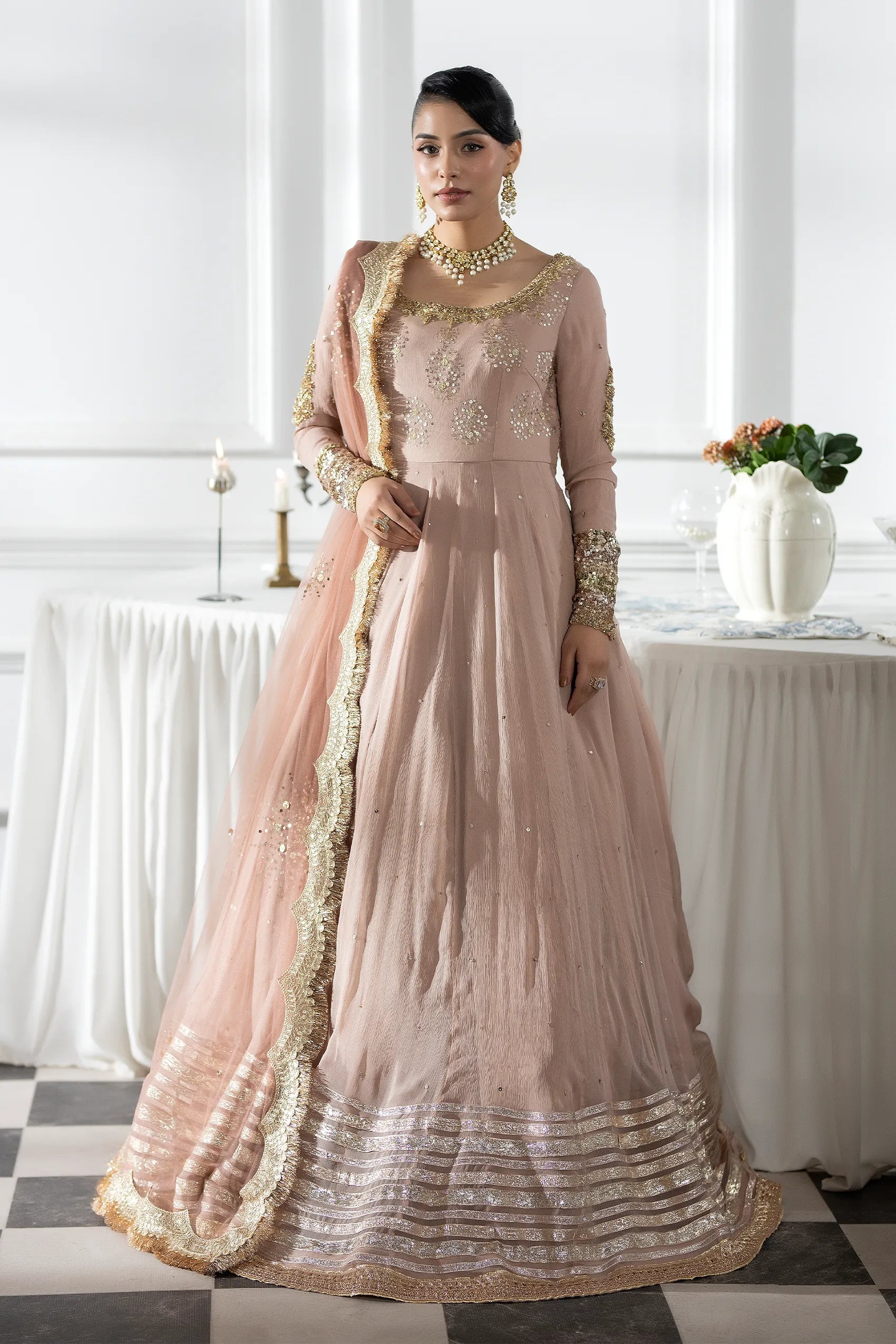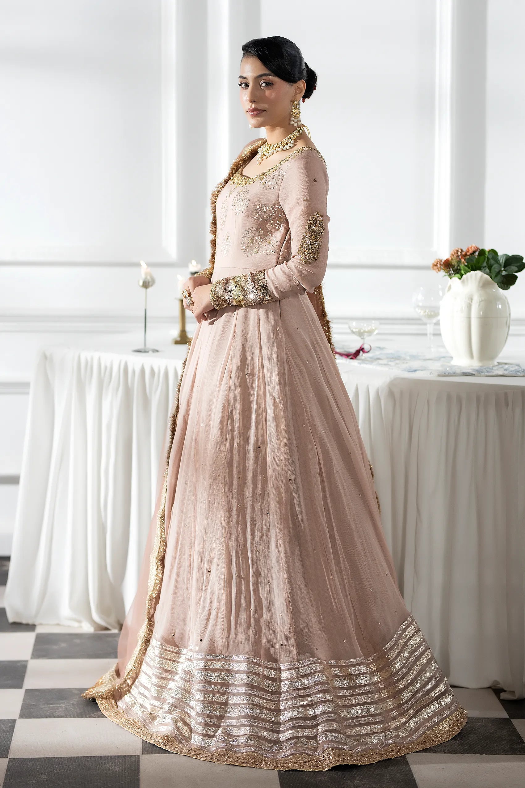 This outfit features a fitted yoke with a scoop neckline drenched in dense sequin work, while the long sleeves boast heavy sequined cuffs that echo a bangle effect. Cut in a high‑waisted kalidaar style, the floor‑sweeping ghera creates dramatic volume. Crafted from fine crinkle chiffon, the dress drapes softly, contrasting its structured metallic embroidery. Multiple horizontal bands of silver and gold gota‑patti finish the hem, grounding the light fabric with regal weight. Delicate scattered sequins (chhan) accent the bodice and upper panels, and a sheer net dupatta with a scalloped kiran border completes the look. All in a dusty‑rose hue—perfect for modern lady or formal events.