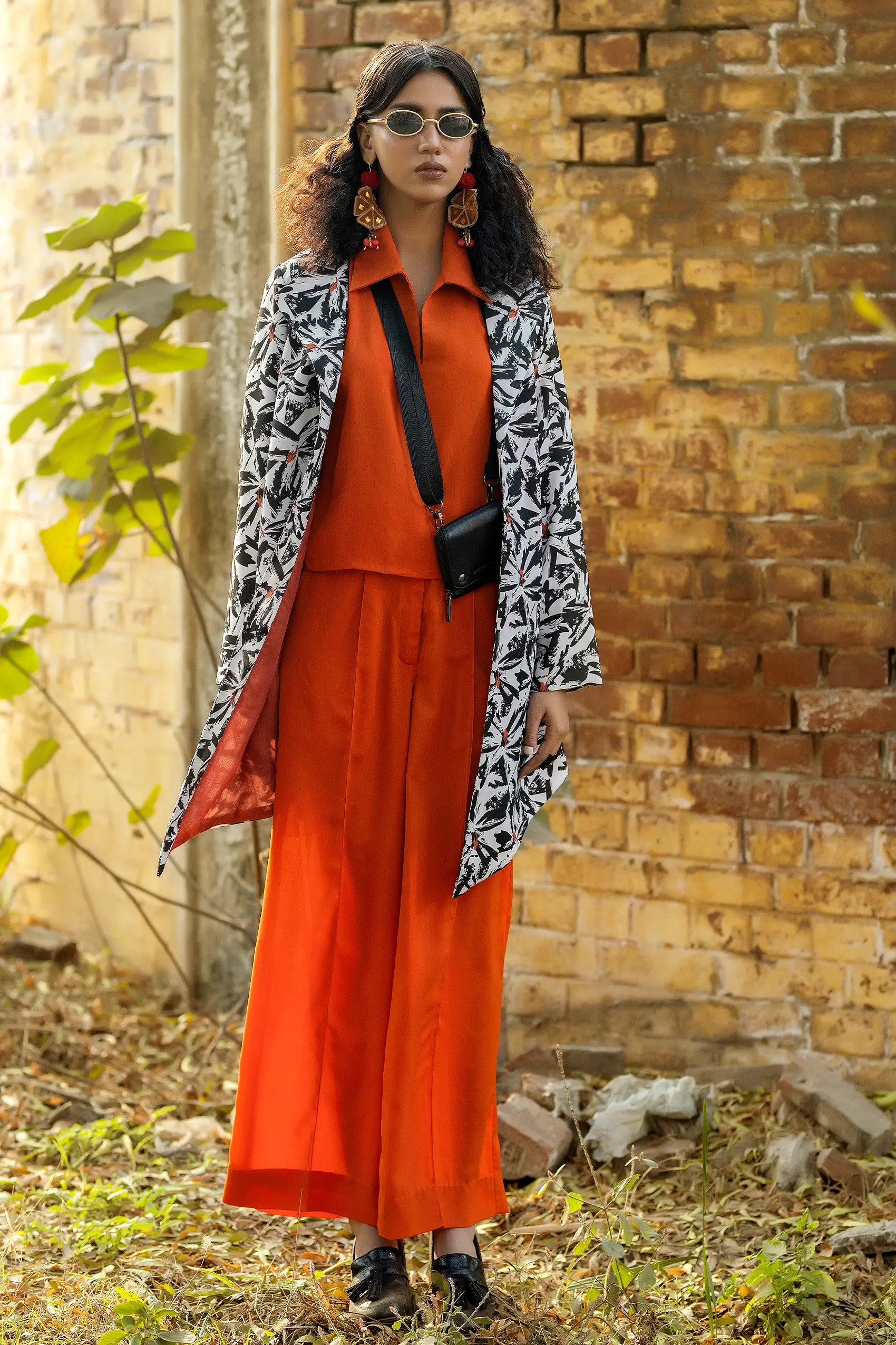 The outfit features a stunning georgette rust blouse that drapes elegantly, offering a soft and flowy silhouette. The blouse is complemented by tailored trousers that provide a sleek and polished look, perfect for both casual and formal occasions. Adding to the ensemble is a beautiful jacket, which enhances the overall style with its intricate design and detailing. The combination of the rich rust color and the flowing materials creates a harmonious and sophisticated appearance, making it a standout choice for any event.