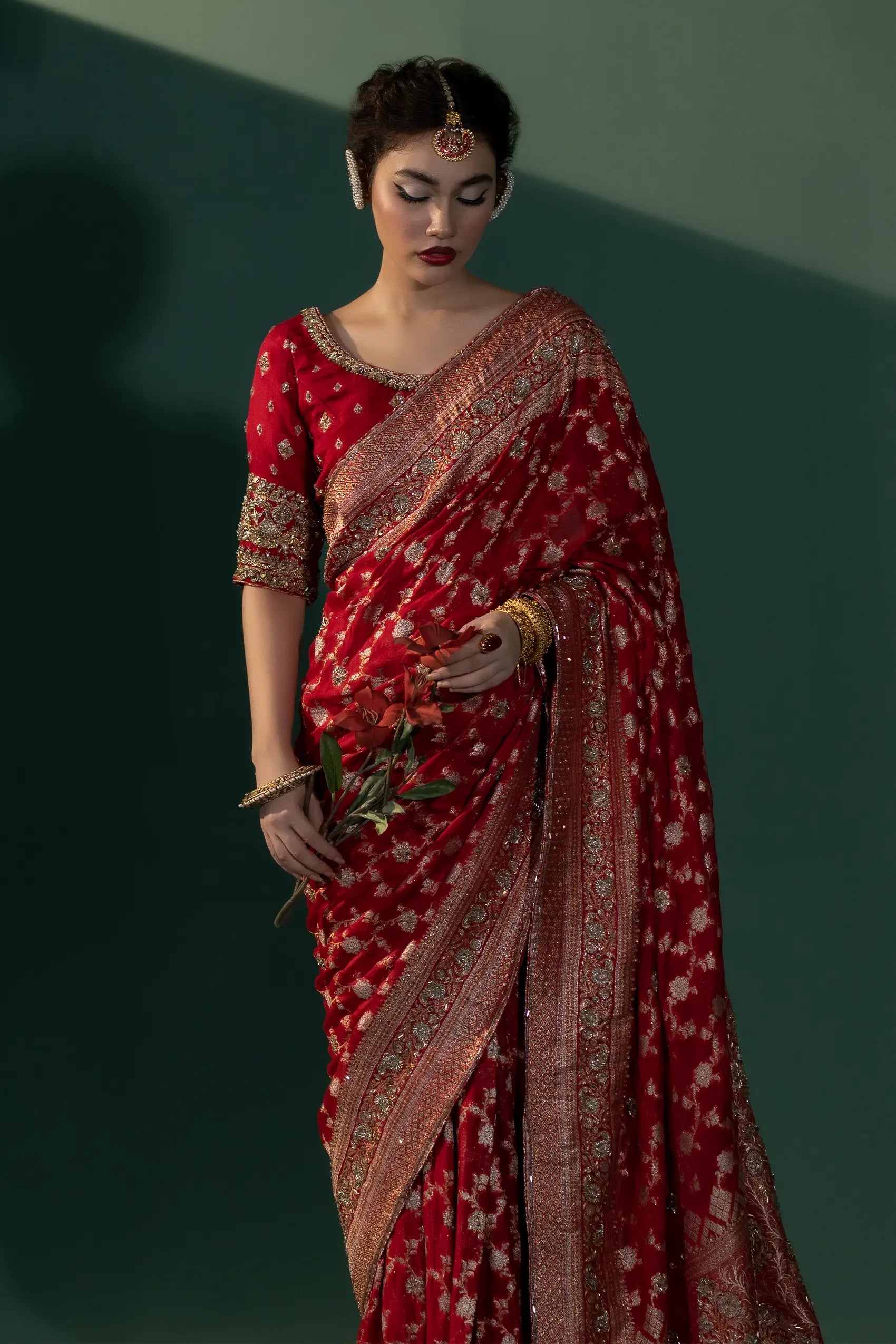 This exquisite saree is crafted from pure Banarsi chiffon in a deep, luxurious maroon hue that exudes sophistication. The intricate embellishments of dabka, cora, crystals, and sequins create a mesmerizing sparkle, making it a true showstopper. The delicate craftsmanship and rich texture of this sari make it perfect for any grand occasion or celebration, ensuring that you will turn heads and leave a lasting impression wherever you go. Its stunning details and elegant design will undoubtedly captivate everyone who lays eyes on it.