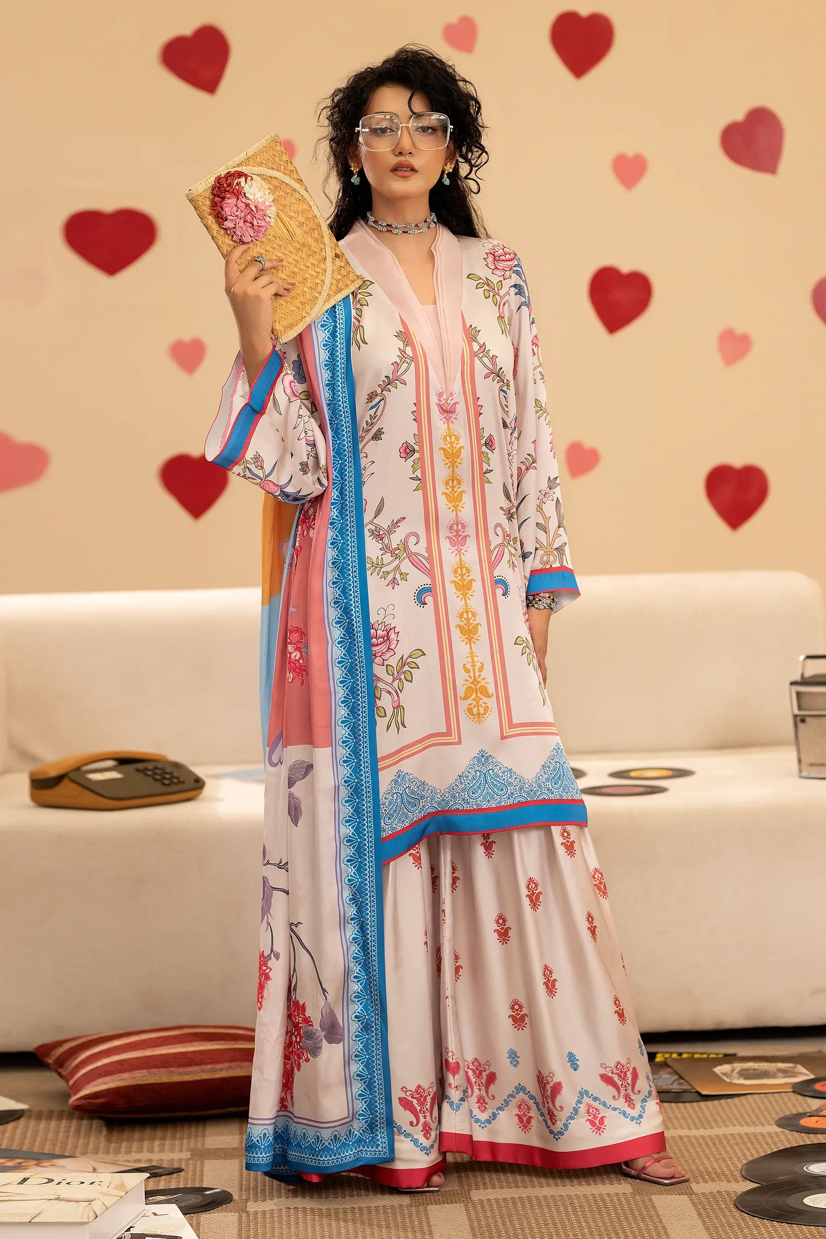 Experience elegance with the Zurain set, featuring a luxurious silk shirt paired with a matching silk gharara and duppata. Perfect for special occasions, this ensemble offers comfort and timeless style in one graceful package.